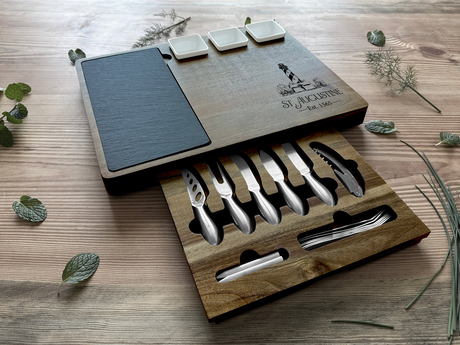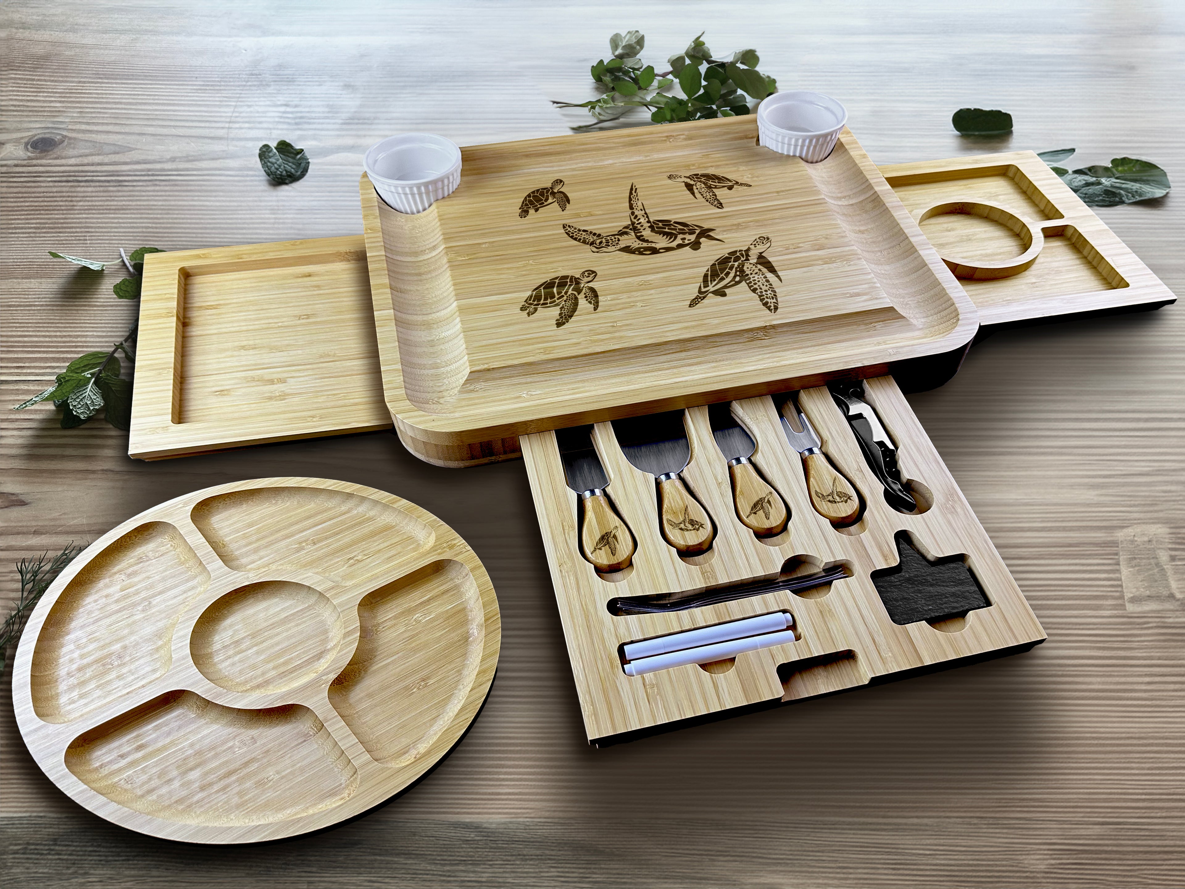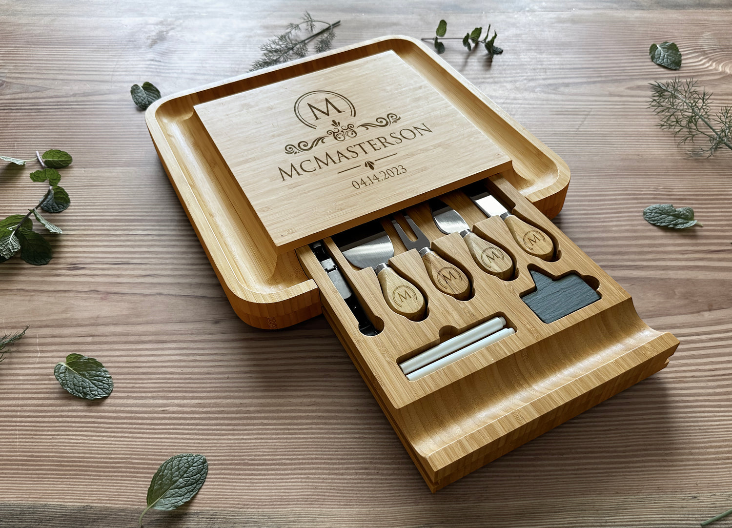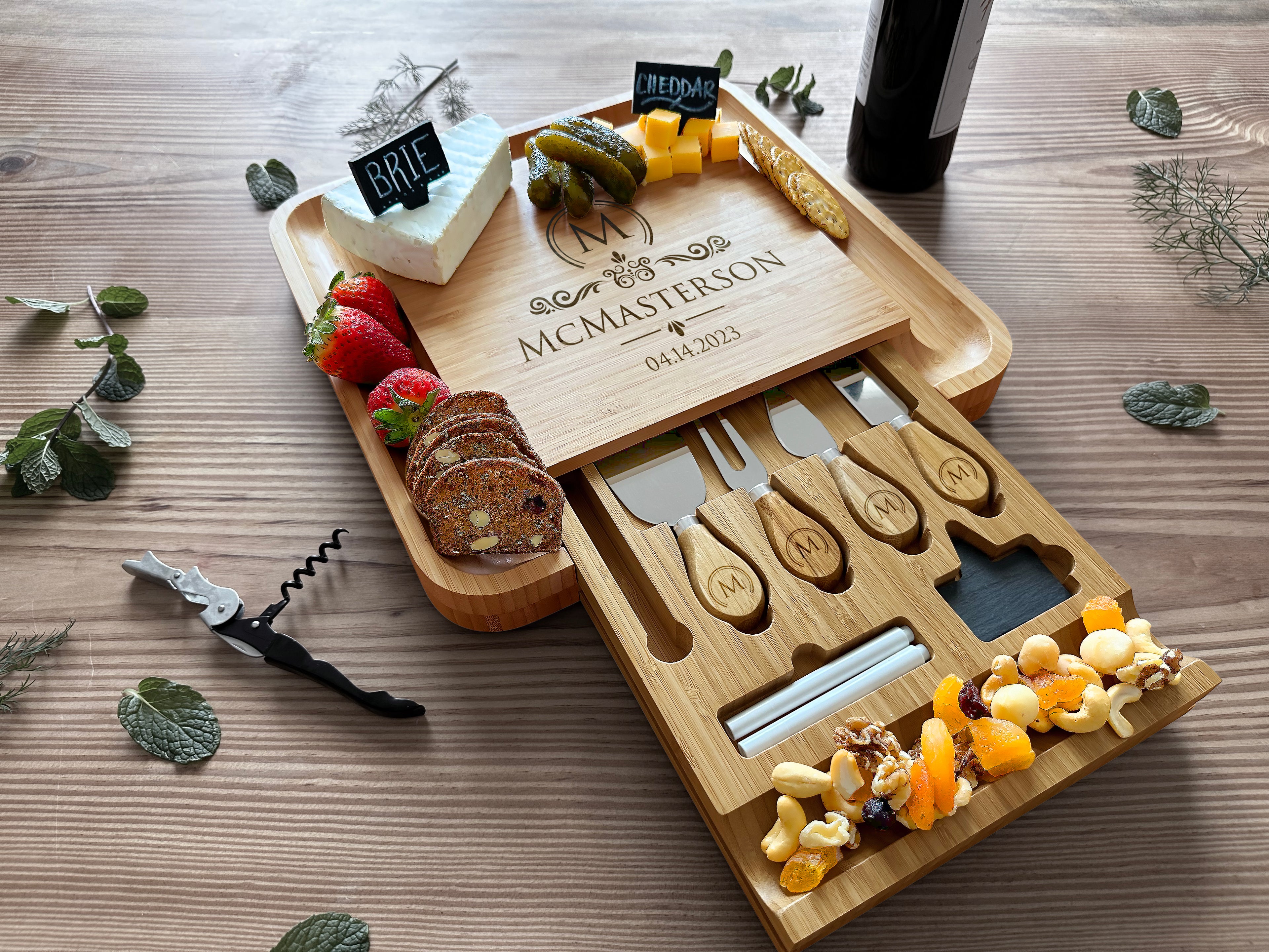 Elevate your entertaining experience with our exquisite Custom Engraved Charcuterie Board set. Crafted from eco-friendly bamboo, this sturdy and chemical-free board features a personalized engraving, making it a timeless centerpiece. Complete with a slide-out drawer housing expertly initialed specialty knives, slates, markers, and a wine opener, it's the perfect fusion of functionality and elegance for your culinary gatherings.